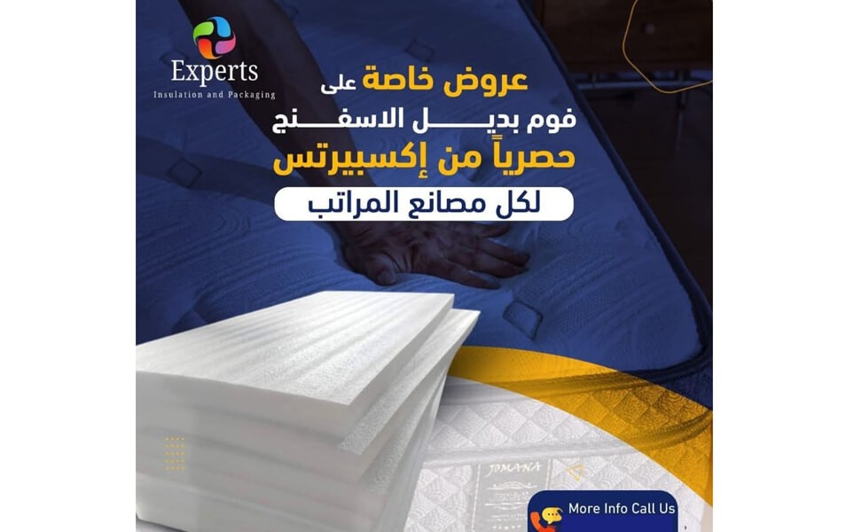 مصنع فوم اكسبرتس للصناعات البلاستيكية | رولات فوم بولى إثيلين منخفض الكثافة EPE - زوايا الحماية - مواسير فوم بكافة أنواعها ومقاساتها - فوم عازل حرارى تحت أرضيات HDF - فوم عازل حرارى تحت سجاد المساجد والمدارس والحضانات - فوم عازل حرارى للأسطح - فوم عازل حر